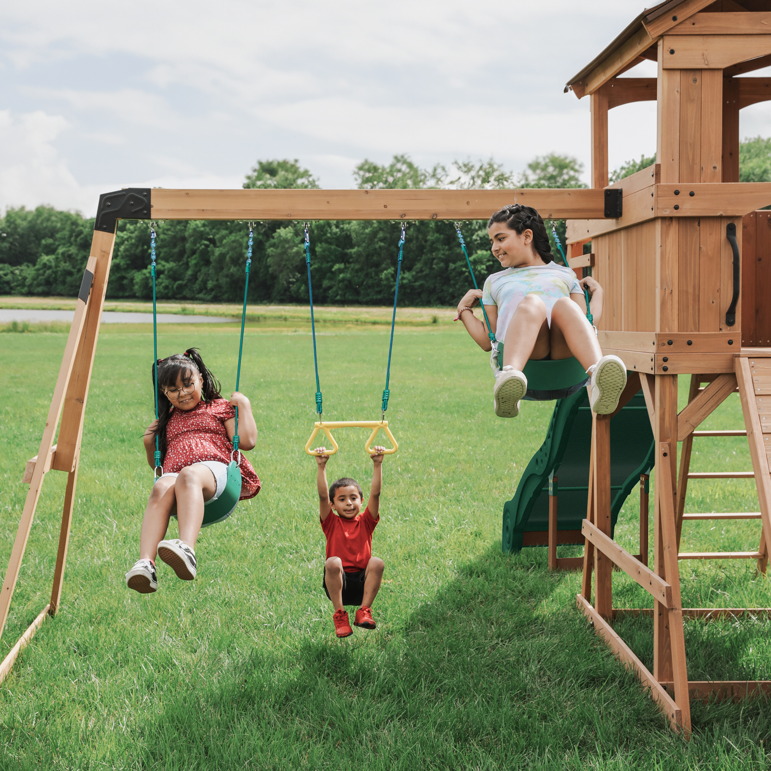 Kiezen tussen rotswanden, een leuke glijbaan, schommels en meer? Je vind het allemaal met het Backyard Discovery Sterling Point Speeltoestel. Het Sterling Point speeltoestel laat de verbeelding van je actieve kindjes de vrije loop! Ze zullen ontelbare uren plezier beleven aan al deze buitenspeelmogelijkheden, Het speeltoestel heeft een groot, verhoogd clubhuis met houten dak voor bescherming tegen de elementen. Er is genoeg ruimte voor meer vriendjes in het voorportaal met een houten brug voor gemakkelijke toegang tot de 152 cm lange rotswand. Koel af door van de 305 cm lange golvende glijbaan te gaan, schommel op één van de 2 bandschommels of probeer de trapeze. Voel het briesje als ze ronddraaien op de 100 cm grote nestschommel. Omdat veiligheid voorop staat bij de speelproducten van Backyard Discovery, kun je gerust zijn in de wetenschap dat het Sterling Point speeltoestel voldoet aan alle veiligheidsnormen en deze zelfs overtreft. Begin nu met het maken van herinneringen met het Sterling Point speeltoestel.