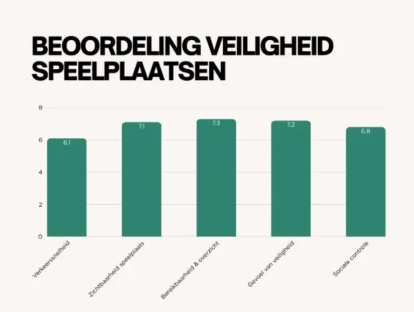 Ook bij de beoordeling van speelplekken komt dat terug. Met name verkeer rond speelplaatsen wordt lager beoordeeld dan andere onderdelen. Omgerekend naar een schaal van 10 krijgt de snelheid van verkeer op aangrenzende wegen een 6,2. Daarmee blijft dit punt achter bij zichtbaarheid en overzicht, die rond of boven de 7 scoren.